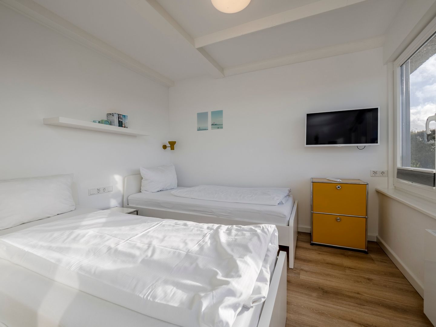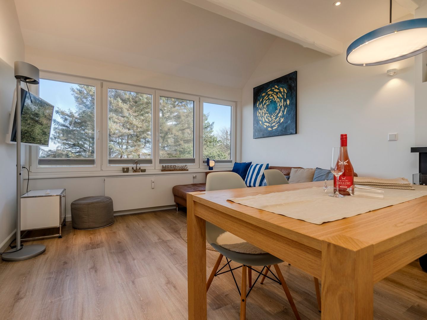 Die Wohnung befindet sich im 1. Obergeschoss und überzeugt durch ihre offene, lichtdurchflutete Raumgestaltung. Das Wohnzimmer mit großer Fensterfront bietet einen herrlichen Blick auf das Meer und geht nahtlos in die voll ausgestattete Küche über, ideal für gemütliche Kochabende. Auf derselben Etage befinden sich zudem ein Schlafzimmer mit zwei Einzelbetten sowie ein modernes Badezimmer mit Dusche.