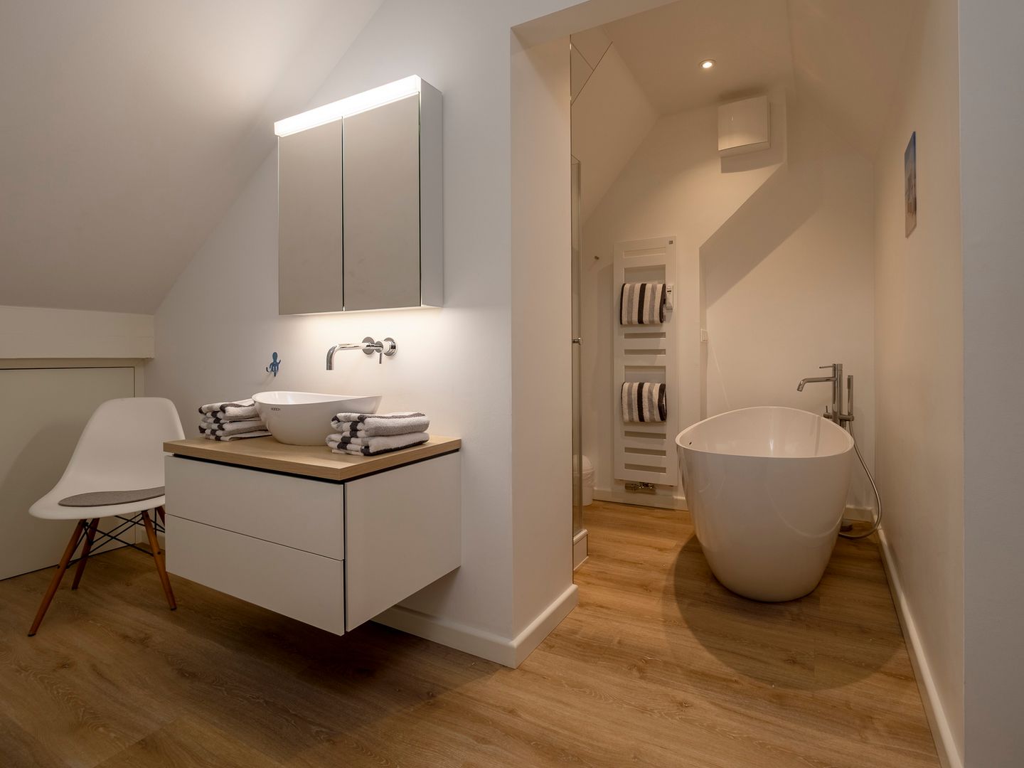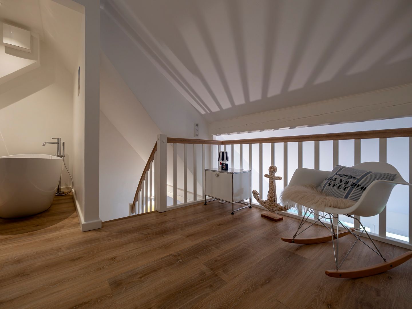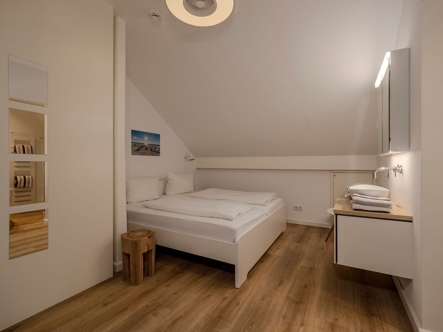 Über eine Treppe innerhalb der Wohnung gelangen Sie in das zweite, offene Schlafzimmer mit komfortablem Doppelbett und einem angrenzenden Badezimmer, ausgestattet mit Dusche und Badewanne, also perfekt für entspannte Stunden nach einem Tag am Meer.